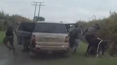 Police footage shows the suspects get caught by a stinger, pile out of the car and run off.